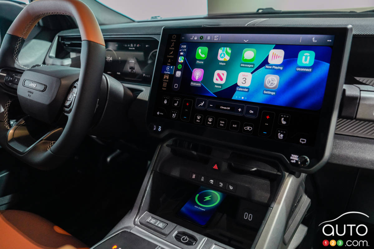 À bord du Recon 2026, on retrouve un écran tactile de 14,5 pouces ainsi qu’une instrumentation numérique de 12,3 pouces. Le tout utilise la technologie Uconnect 5.