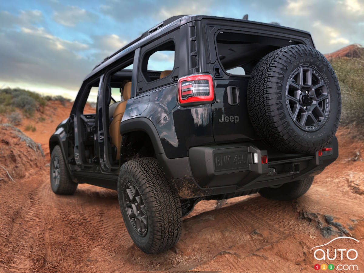 Comme le confirment les images distribuées, le Recon 2026 s’affiche comme un authentique VUS de la marque Jeep, avec un style apparenté à ses autres modèles. On remarque, entre autres, que les feux s’inspirent de l’emblématique Wrangler, tout comme le hayon à ouverture latérale et le pneu de secours bien visible.